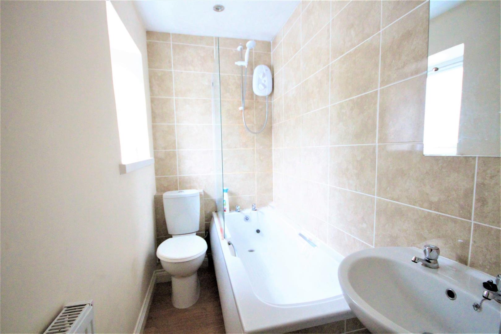 - Family bathroom with shower over the bath.