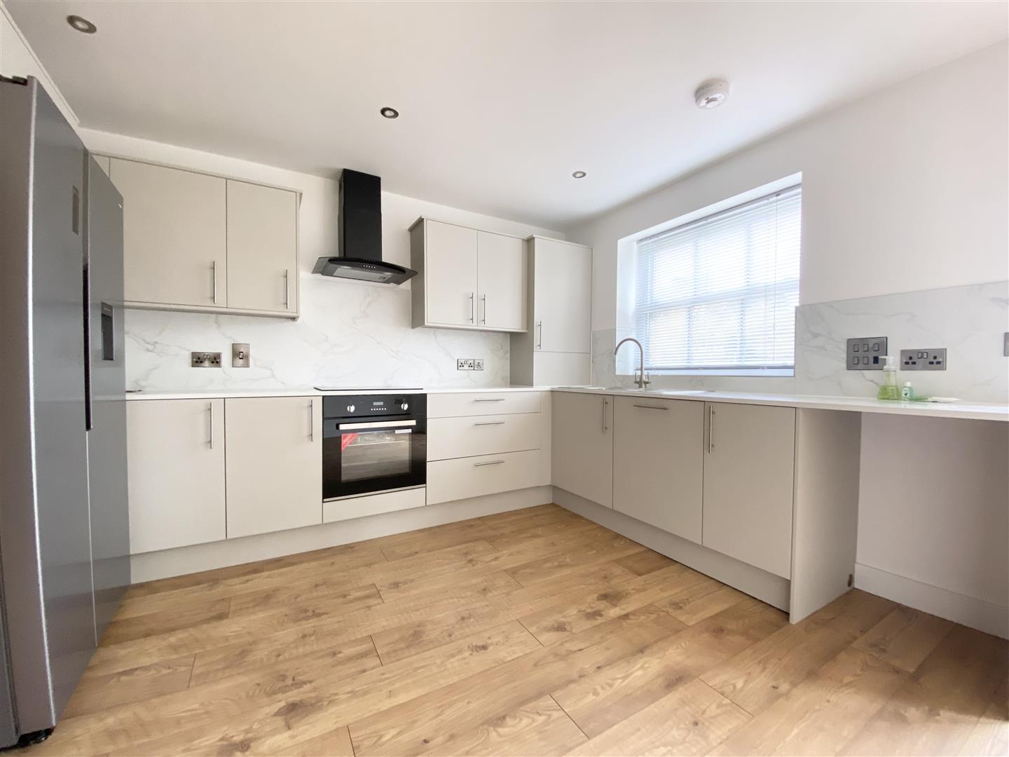 Open plan kitchen diner with French Doors leading to rear garden. Kitchen is equipped with large American style fridge freezer and dishwasher. Space for washing machine. Integrated oven and hob with extraction over.